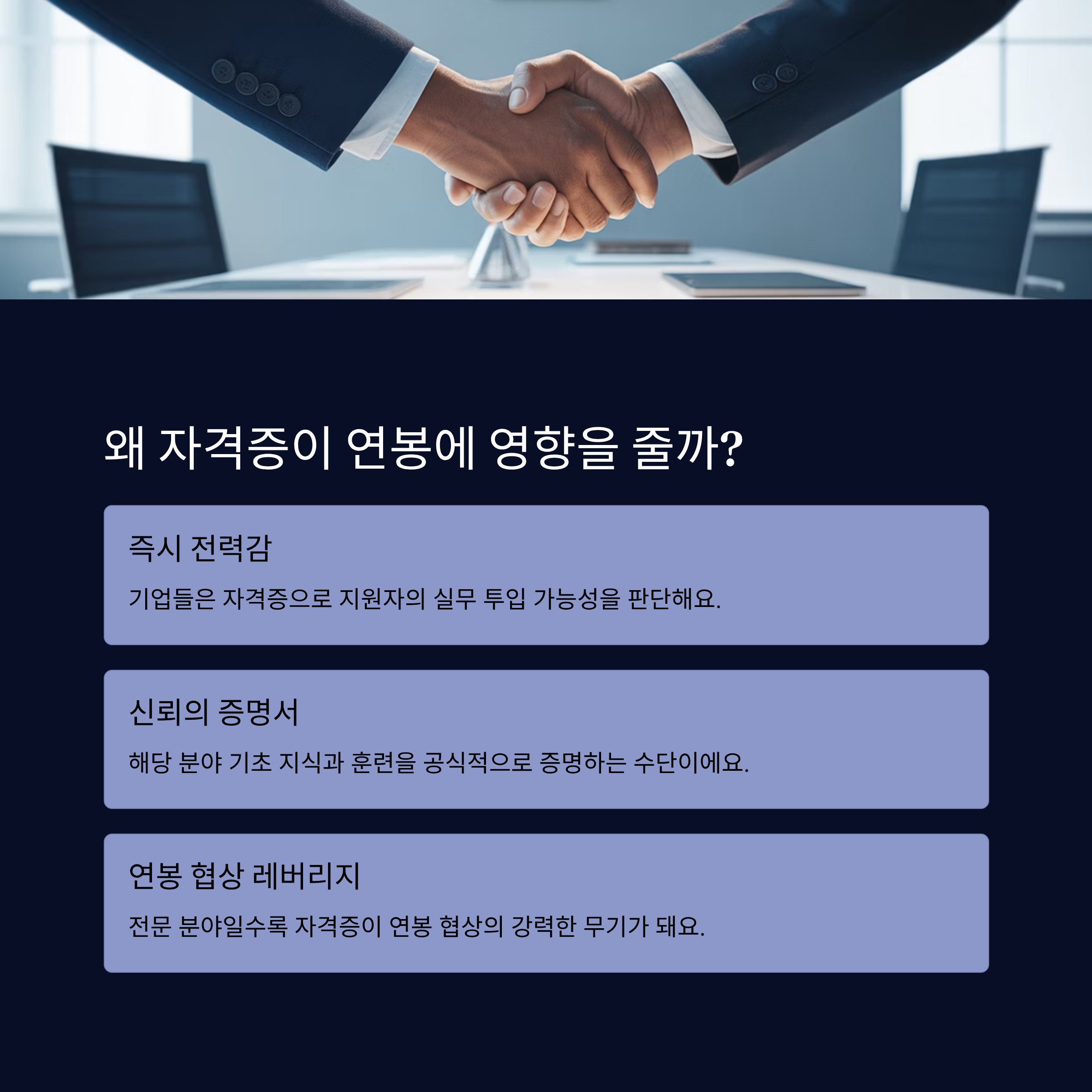IT, 회계, 마케팅, 건축, 금융 등 전문 분야일수록 자격증은 ‘자격 있는 사람’이라는 이미지로 이어져요. 이런 첫인상이 결국 연봉 협상의 레버리지가 되는 거예요. 그러니 자격증은 단순한 스펙이 아니라 연봉을 바꾸는 실질적 수단이 되는 거랍니다!