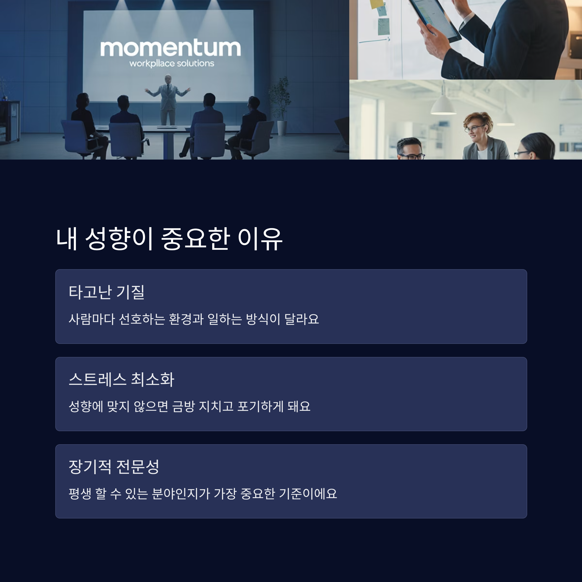 사람은 누구나 타고난 기질과 성향이 있어요. 이 성향은 우리가 어떤 환경에서 스트레스를 덜 받고, 어떤 일을 할 때 몰입하고 즐거움을 느끼는지와 깊은 관련이 있어요. 자격증도 마찬가지예요. 내가 선호하는 방식과 어울리지 않는 분야라면 아무리 유망 자격증이라도 금방 지치게 되거든요.