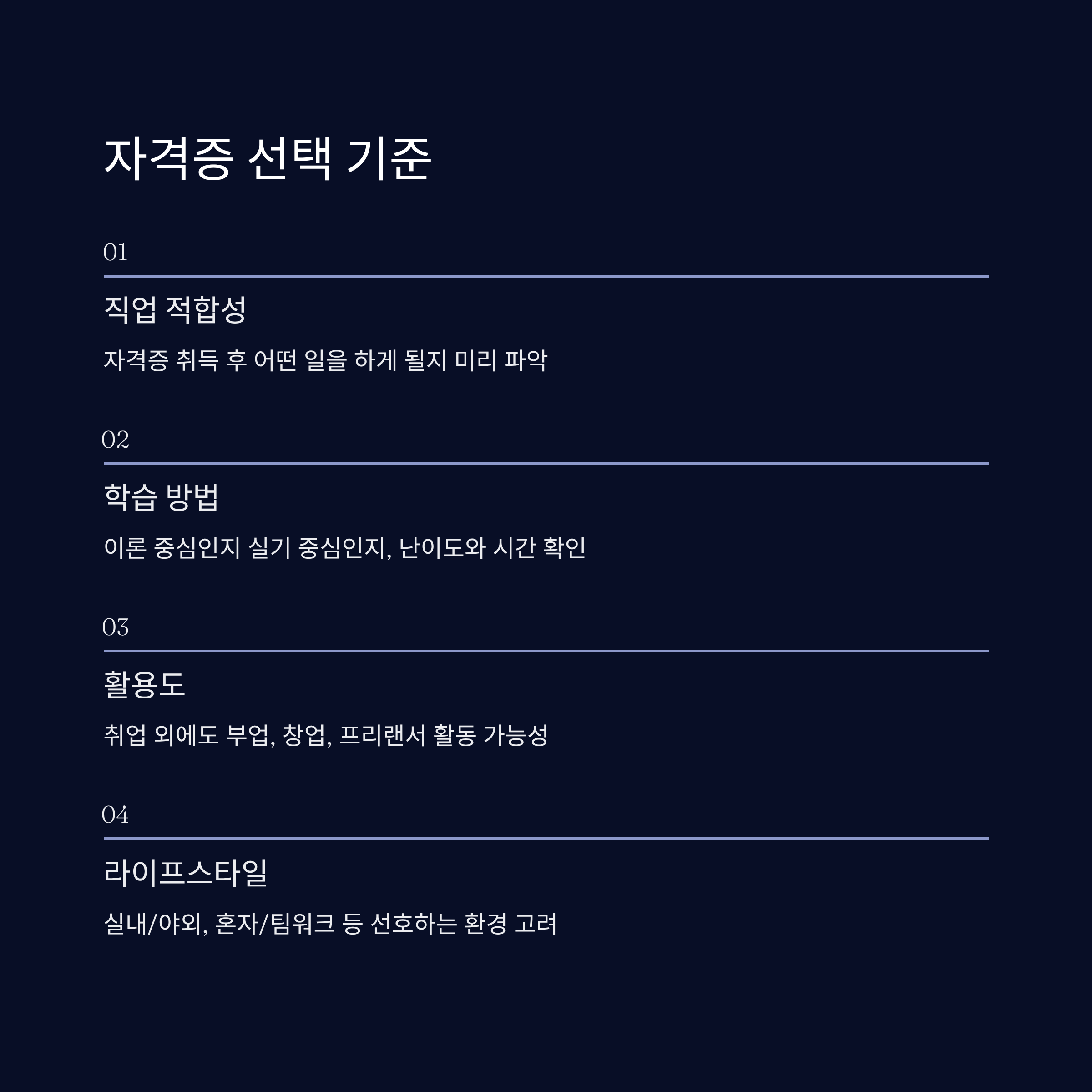 이제 조금 감이 잡히죠? 😊 다음은 자격증을 선택할 때 꼭 고려해야 하는 기준들에 대해 자세히 알아볼게요!