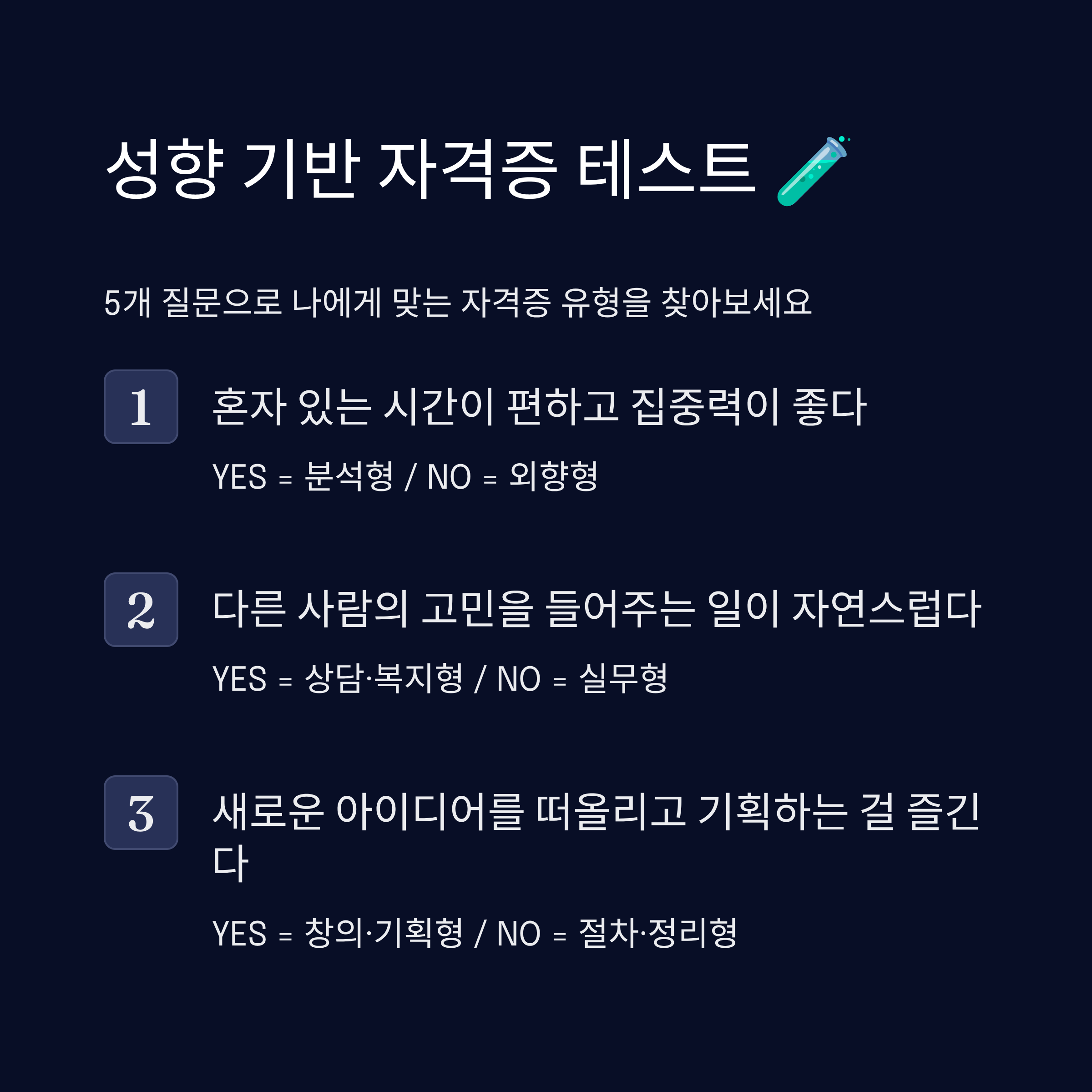 이제 다음 섹션에서는 재미있게 풀어볼 수 있는 자격증 성향 테스트를 소개할게요! 아주 간단하지만, 꽤 정확해서 깜짝 놀랄지도 몰라요 😎