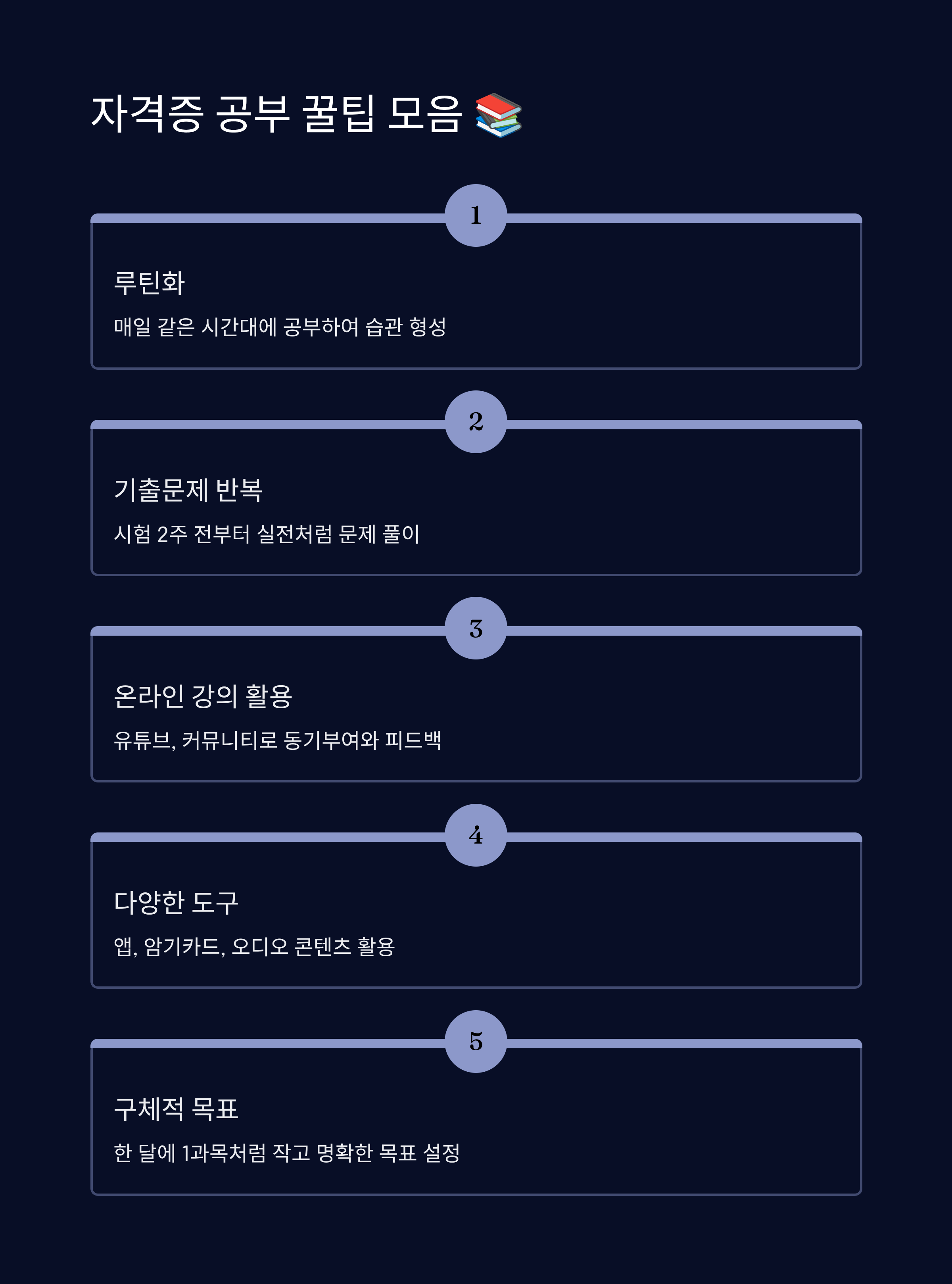 넷째, 책상만 바라보지 말고, 앱이나 암기 카드, 오디오 콘텐츠 등 다양한 공부 도구를 활용해보세요. 지루하지 않게 유지하면서 자격증 공부를 생활화하는 것이 가장 현실적인 전략이에요 📱