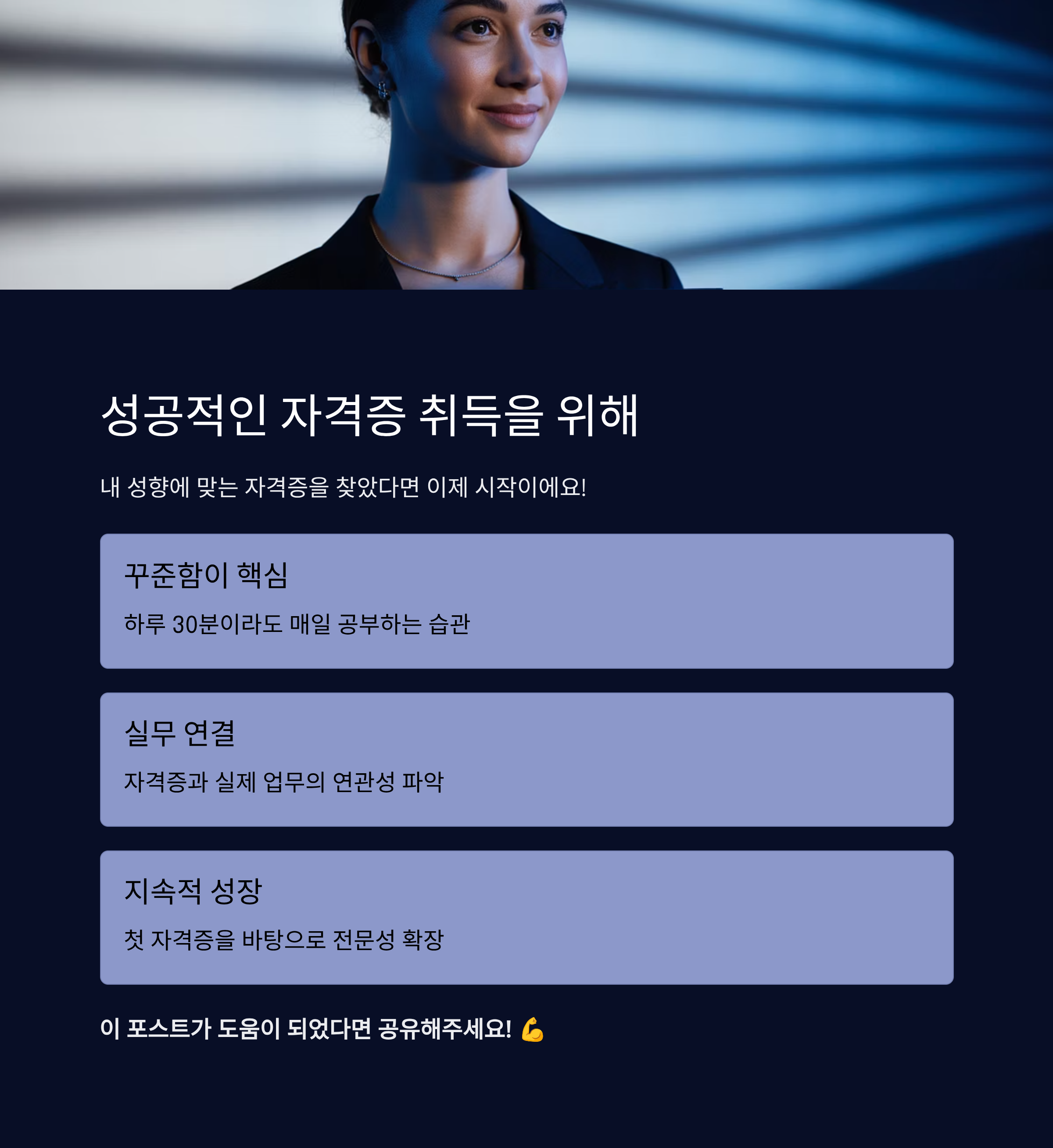 이처럼 성향에 따라 추천 자격증이 완전히 달라지니까, 아무 자격증이나 따는 건 위험할 수 있어요. 지금 내 성향과 앞으로의 삶을 연결하는 가장 현실적인 방법이 바로 자격증 선택이랍니다 ✨