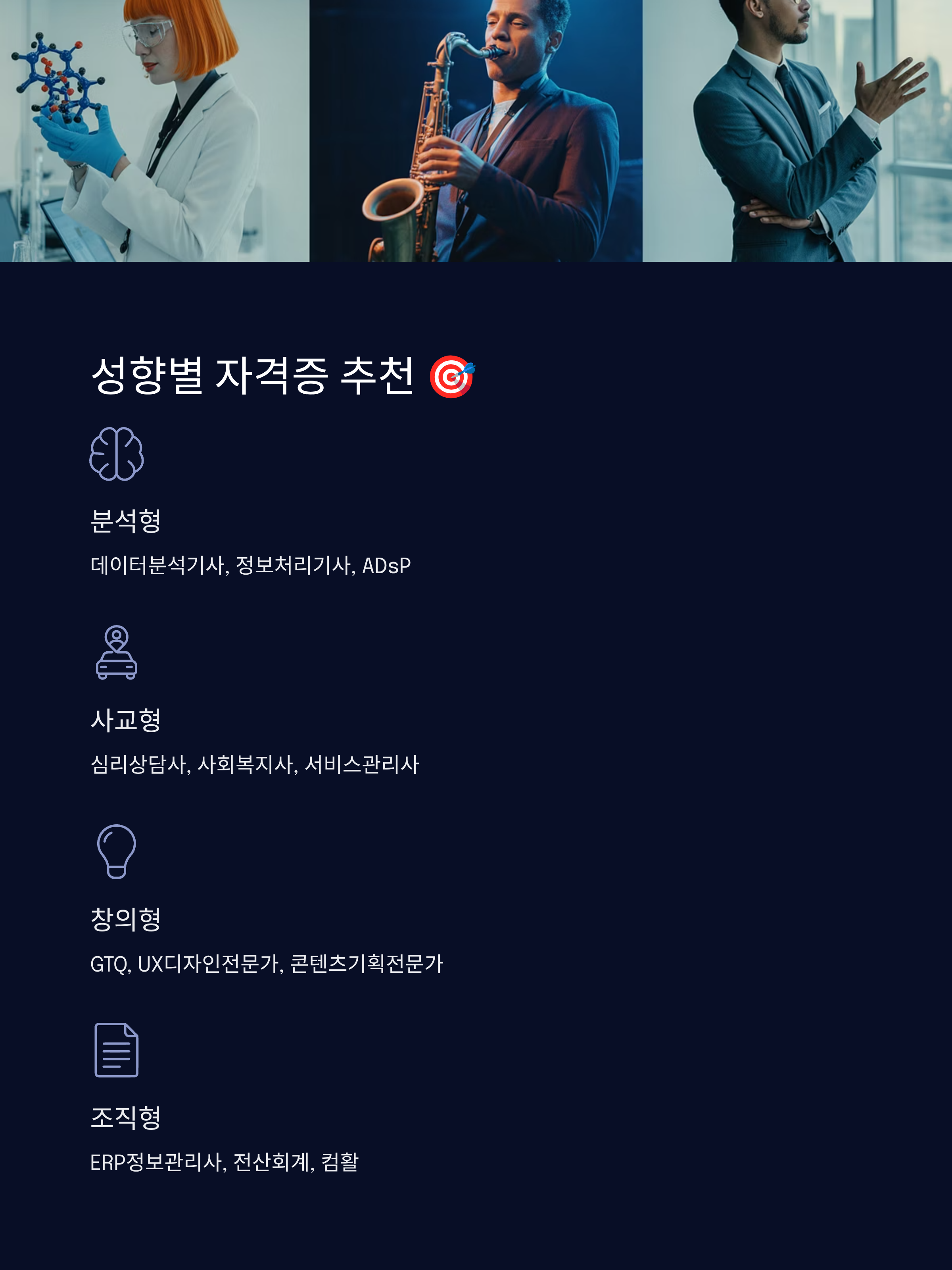 자신의 성향에 맞는 자격증이 보이셨나요? 이제 다음 섹션에서는 성향별로 가장 추천되는 자격증을 구체적으로 설명드릴게요!